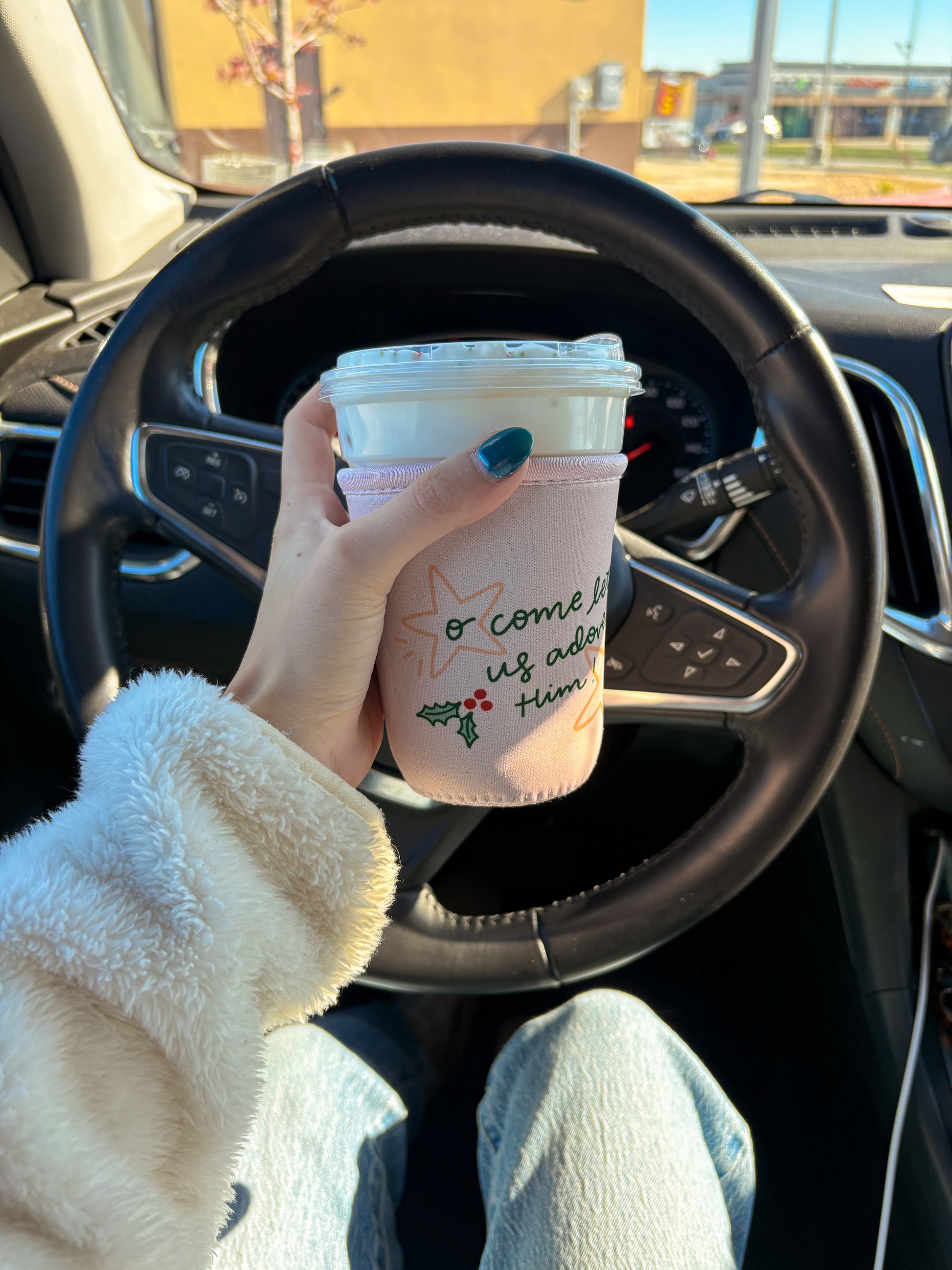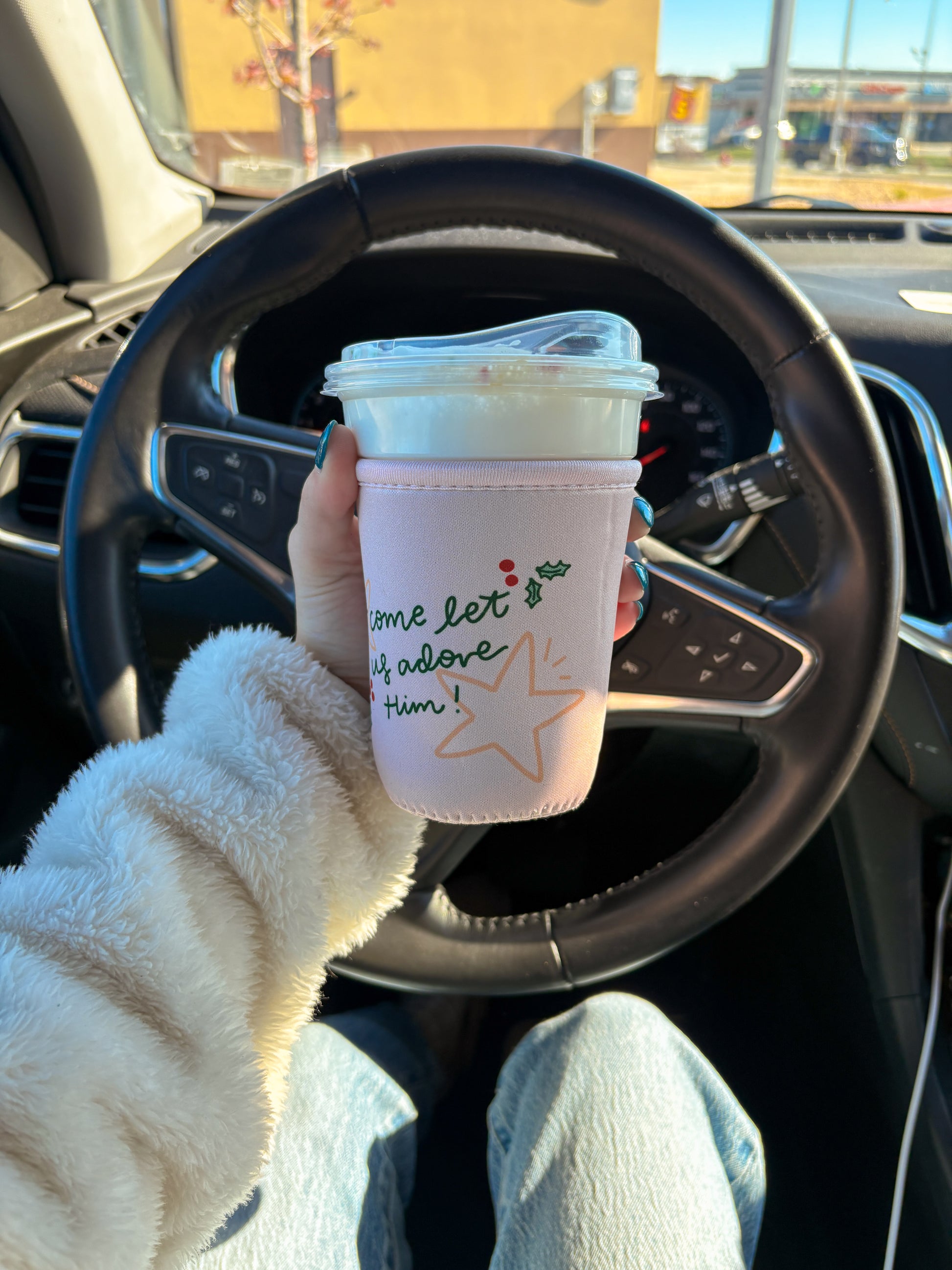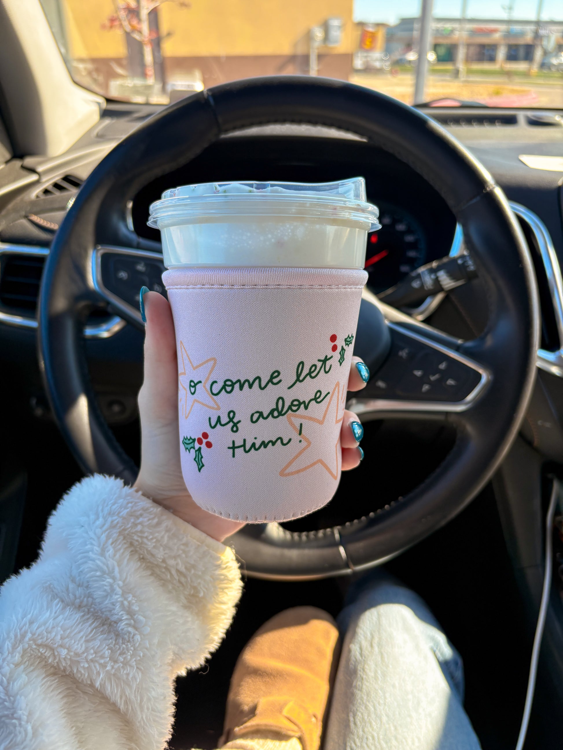 Hand drawn design that says “O come let us adore Him” with stars and holly, on a light pink/beige background