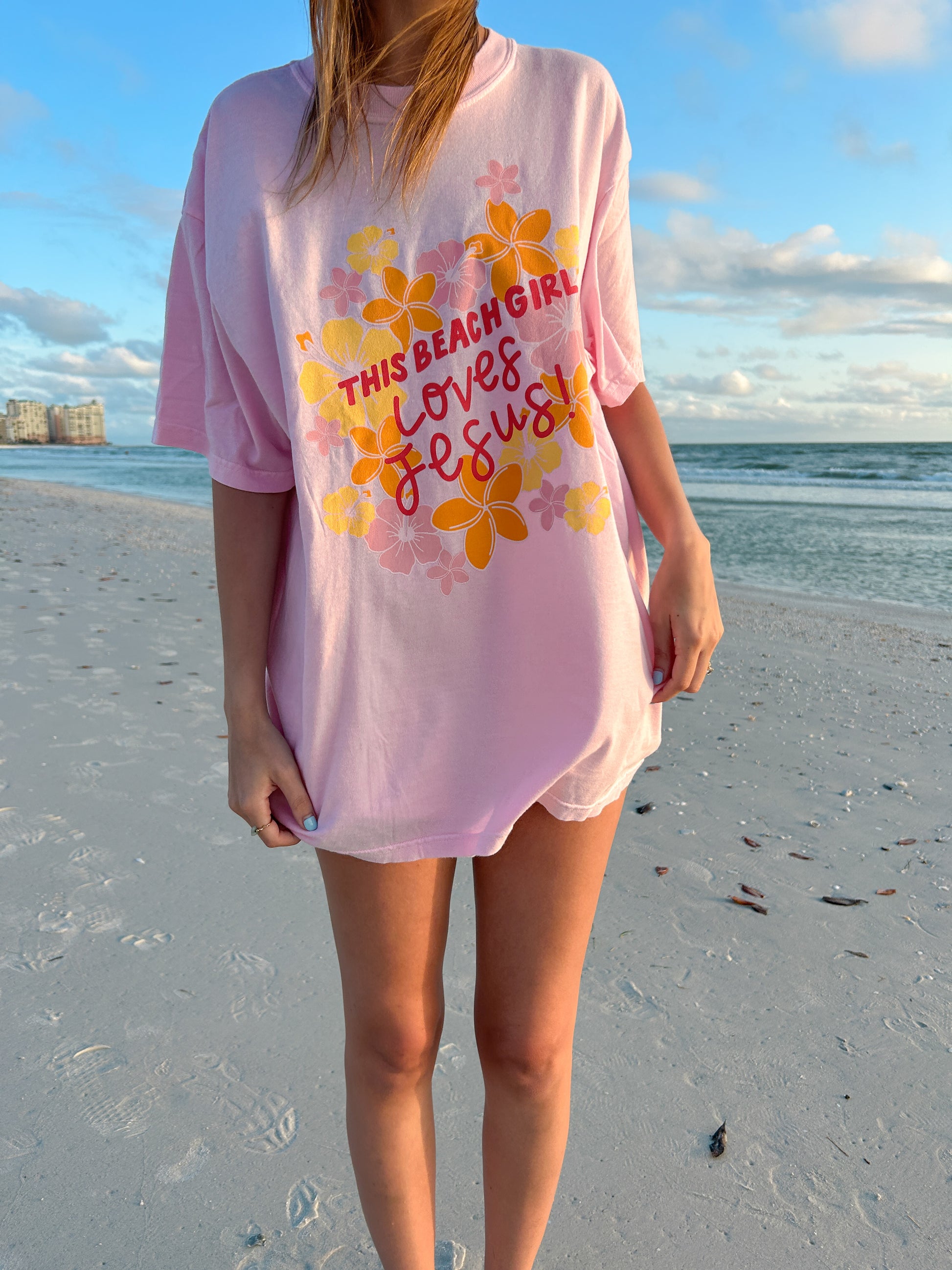 “This Beach Girl loves Jesus” screenprinted on the front with hibiscus flower doodles