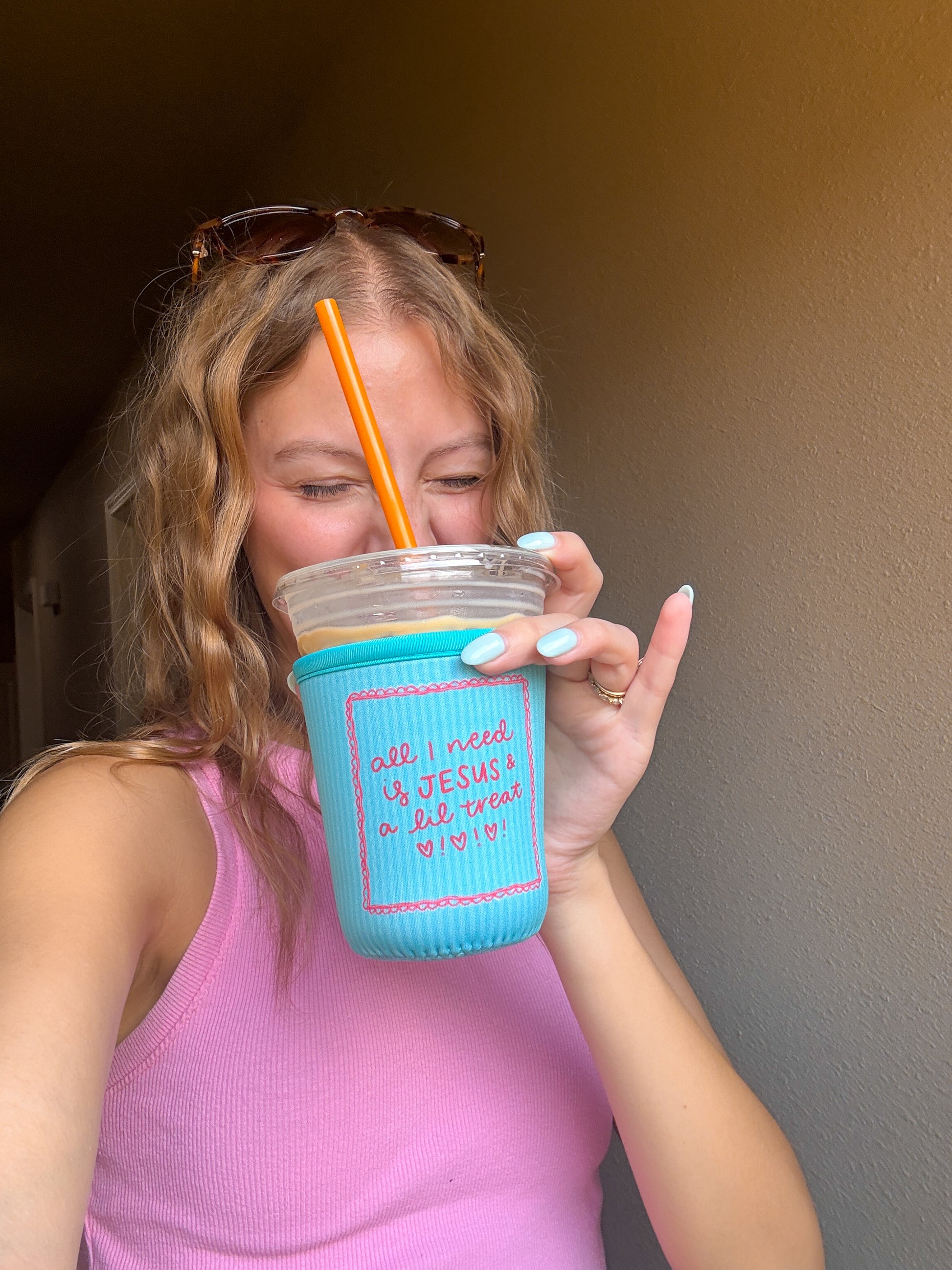 The cutest drink coozie !!! Hand drawn design that says “All I need is Jesus and a lil treat” !! On a blue striped background
