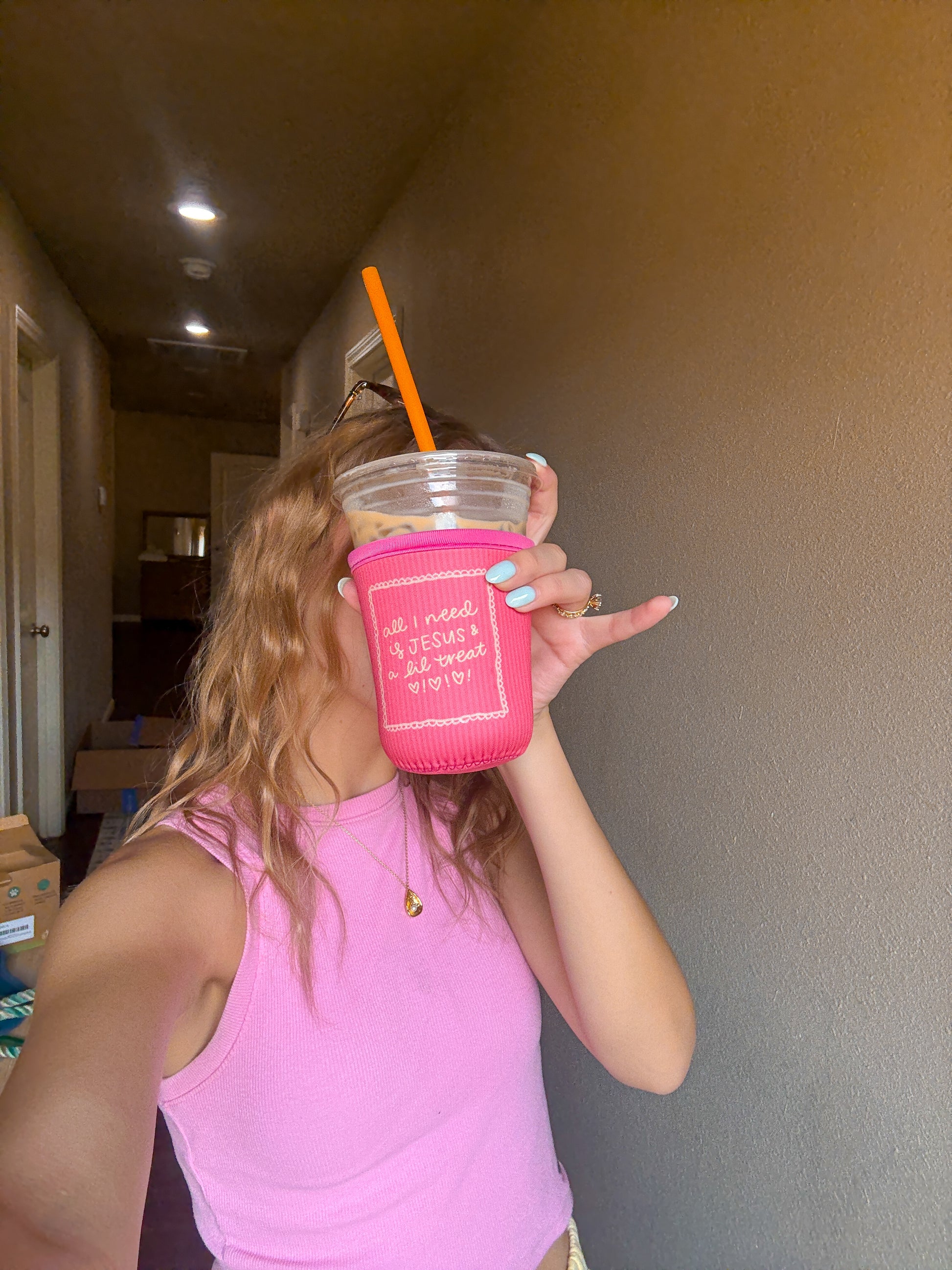 The cutest drink coozie !!! Hand drawn design that says “All I need is Jesus and a lil treat” !! On a pink striped background