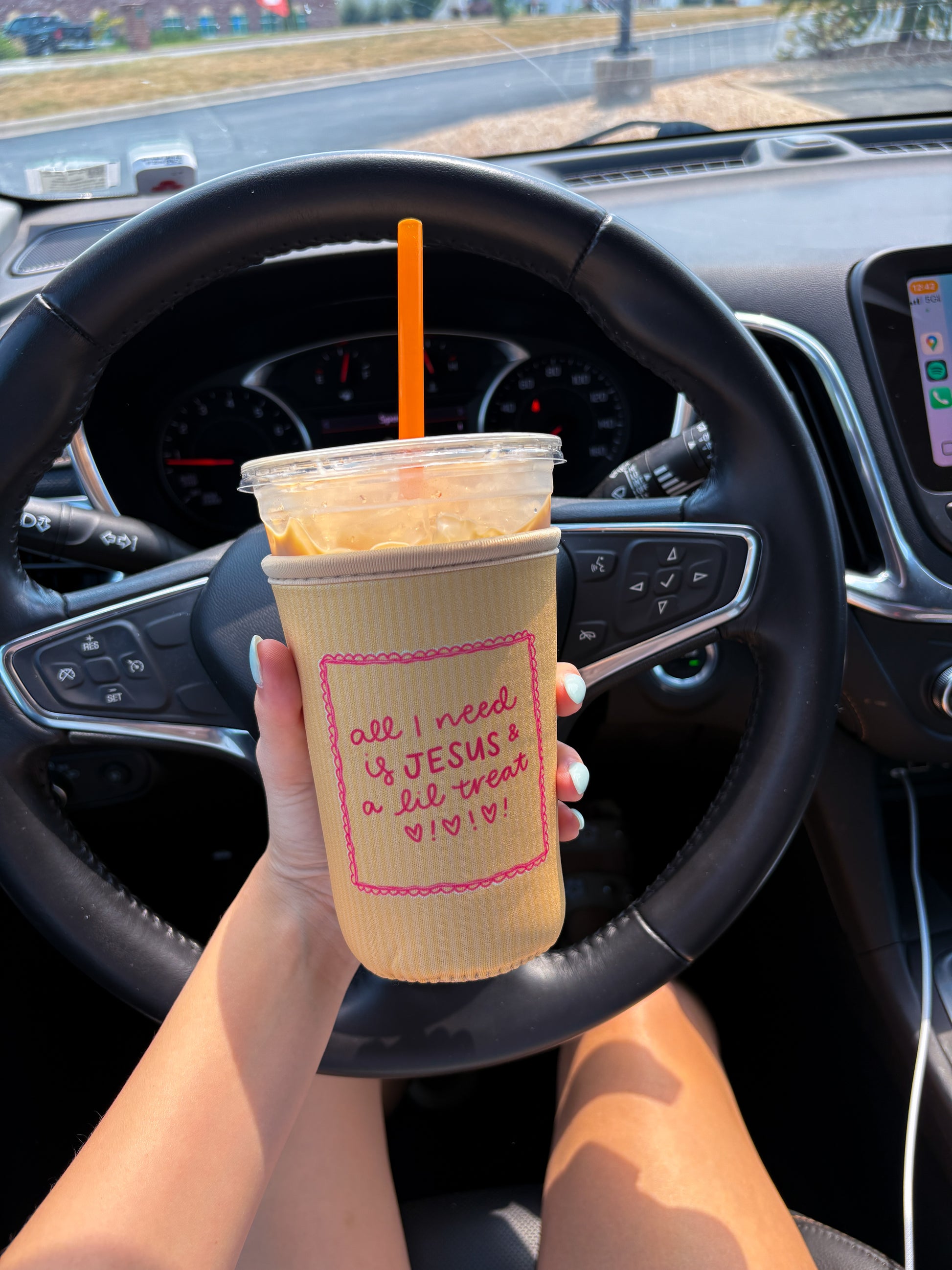The cutest drink coozie !!! Hand drawn design that says “All I need is Jesus and a lil treat” !! On a yellow striped background