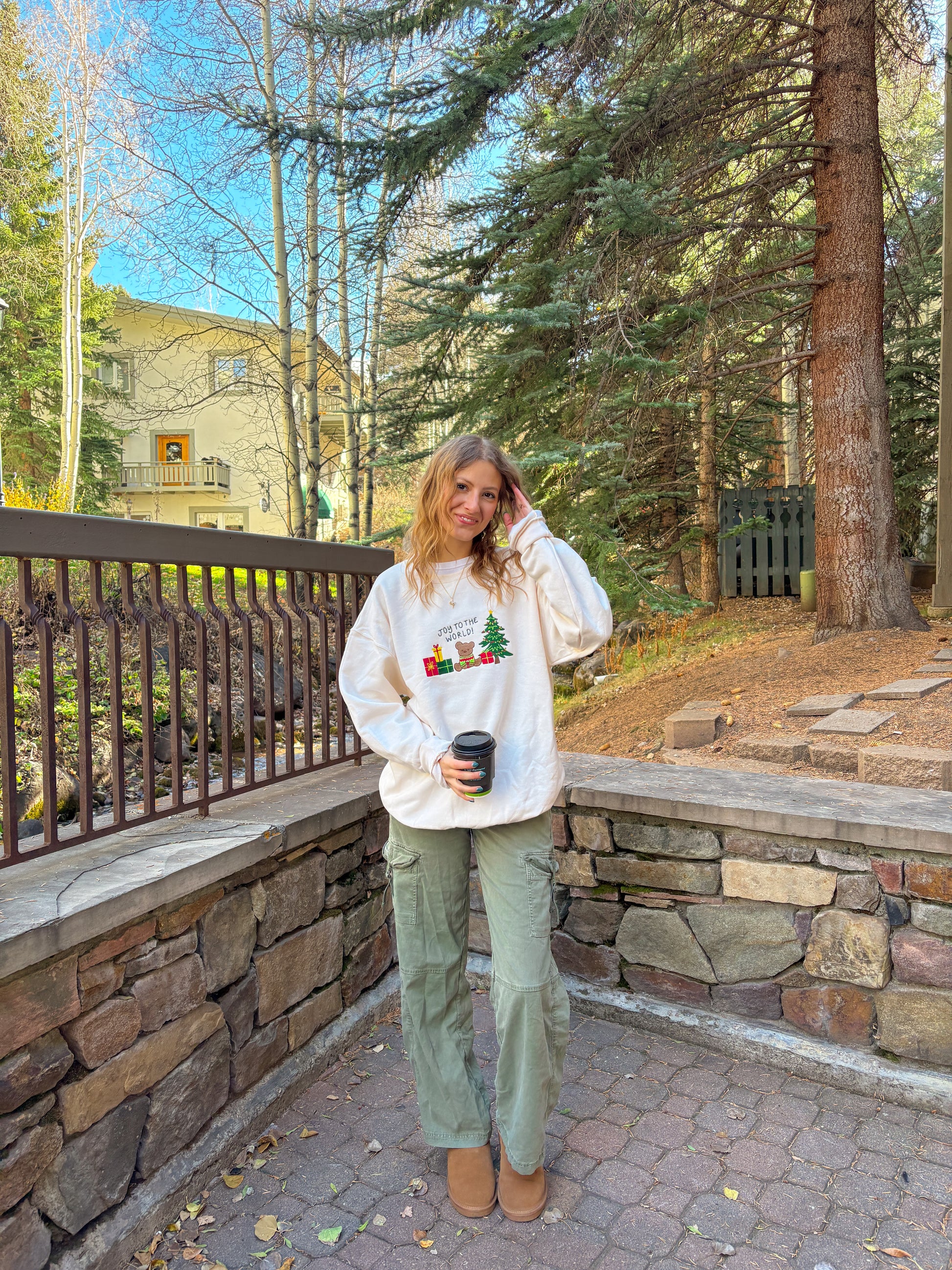 ”Joy to the World” embroidered on the front with a teddy bear holding hot cocoa, a tree, and presents
