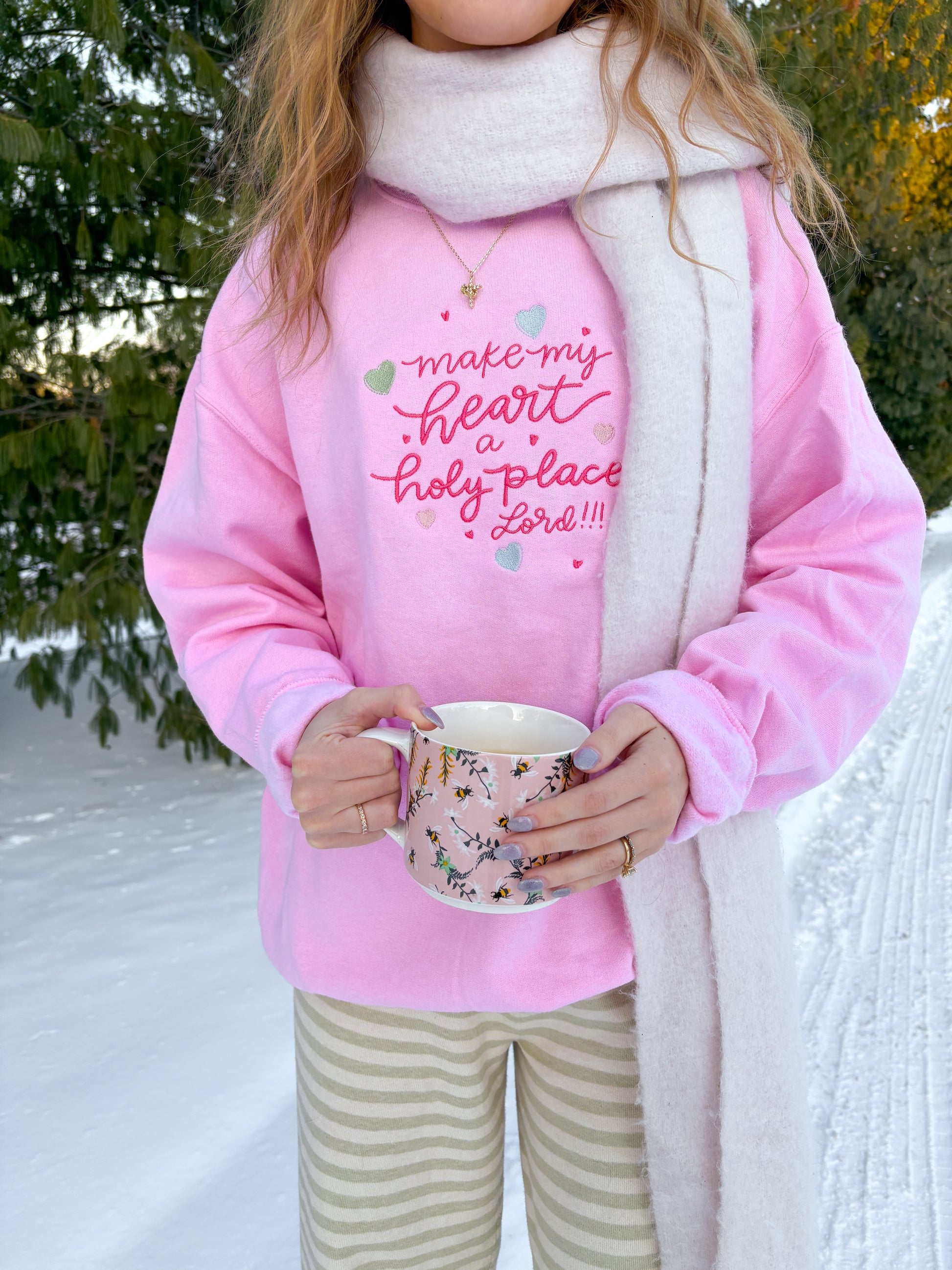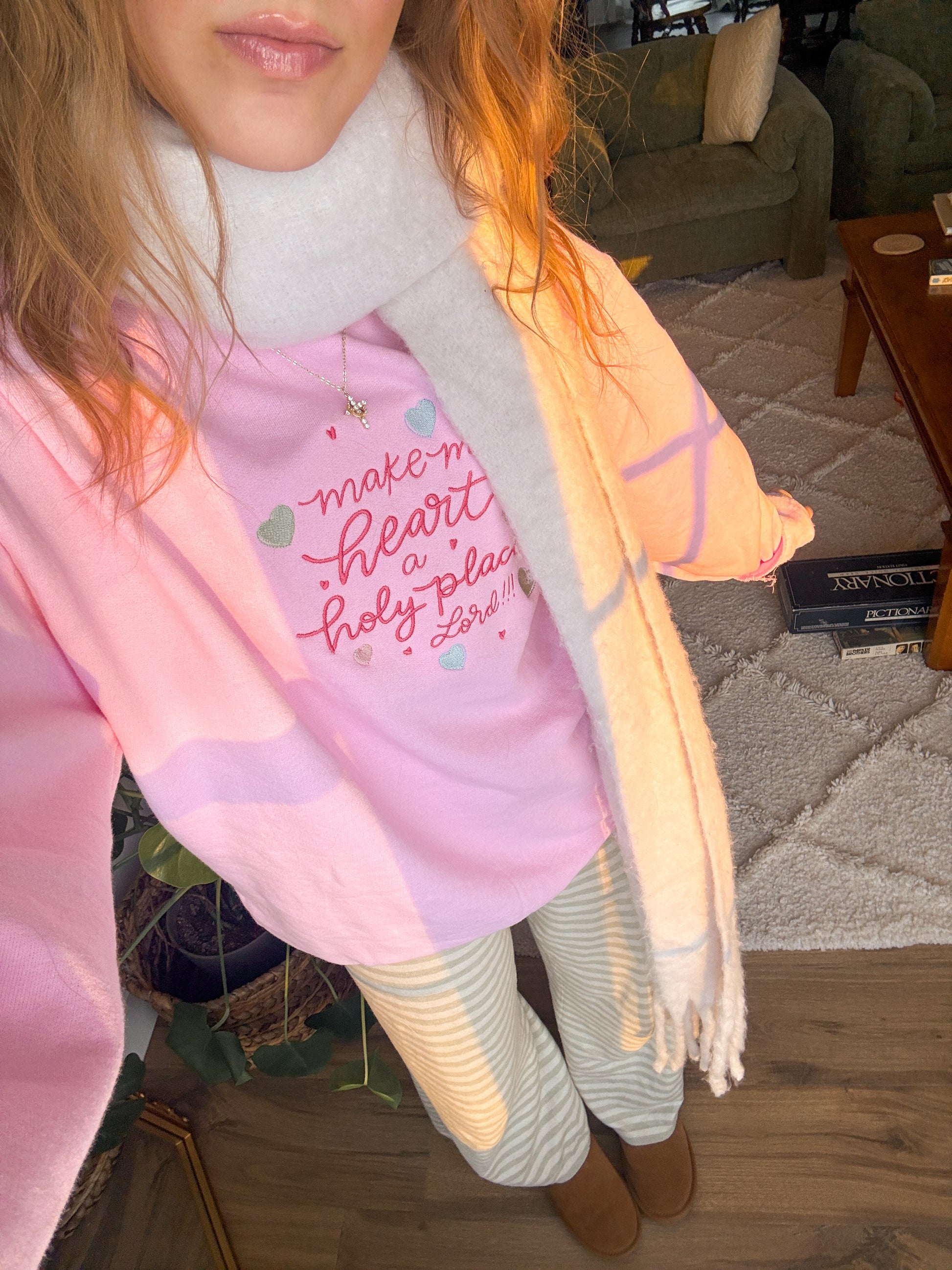 “Make my heart a holy place Lord” embroidered on the front with candy hearts