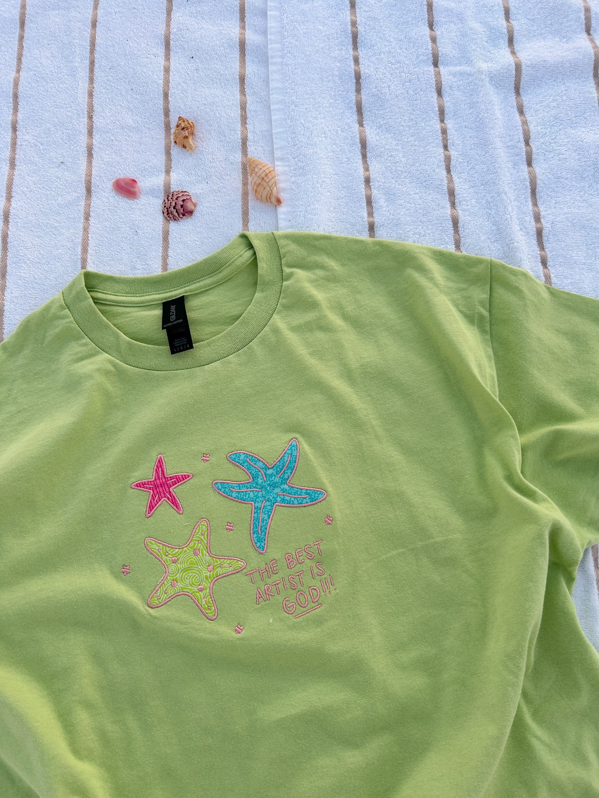 “The best artist is God” embroidered on the front of the t-shirt with appliqué starfish