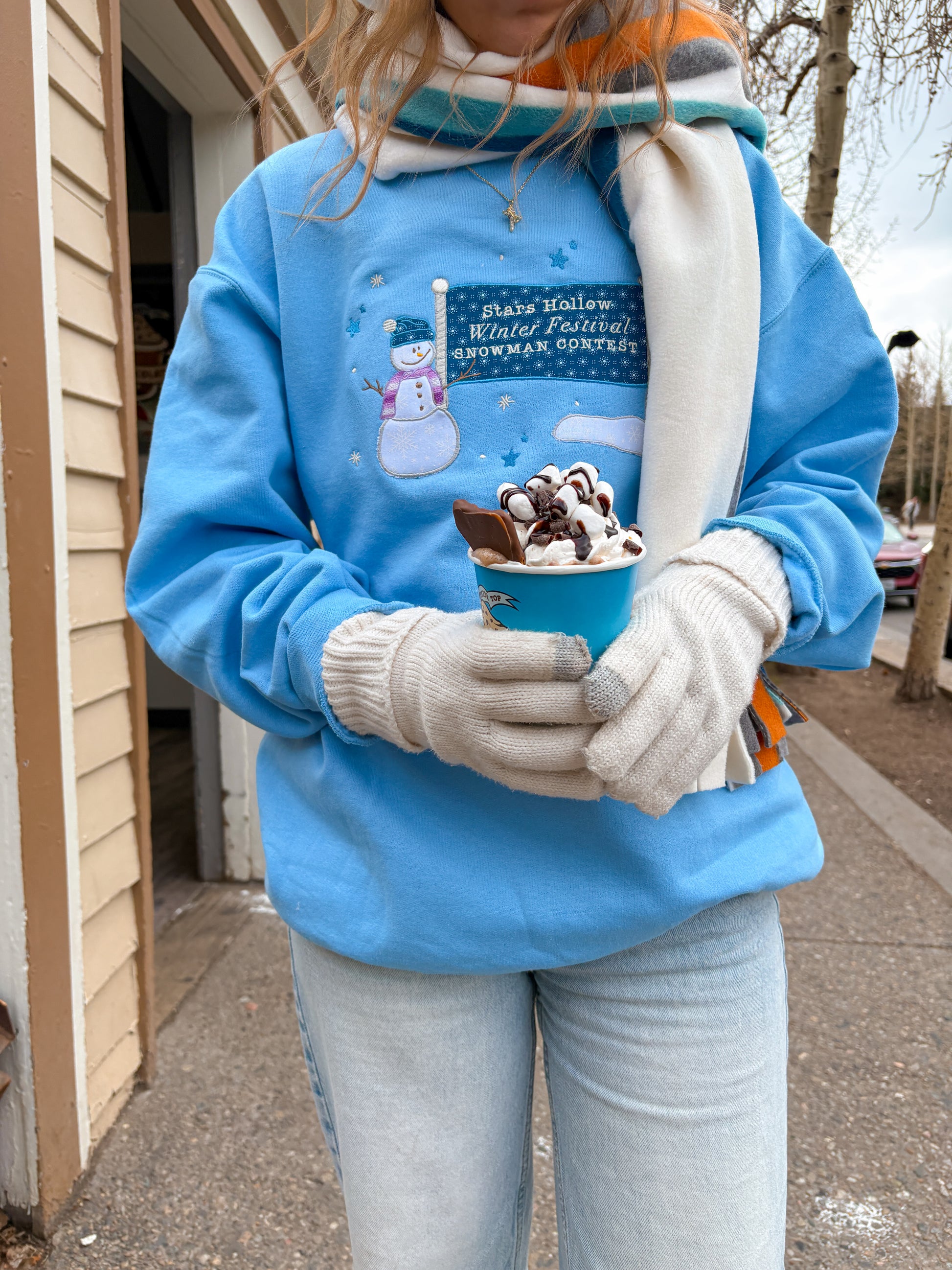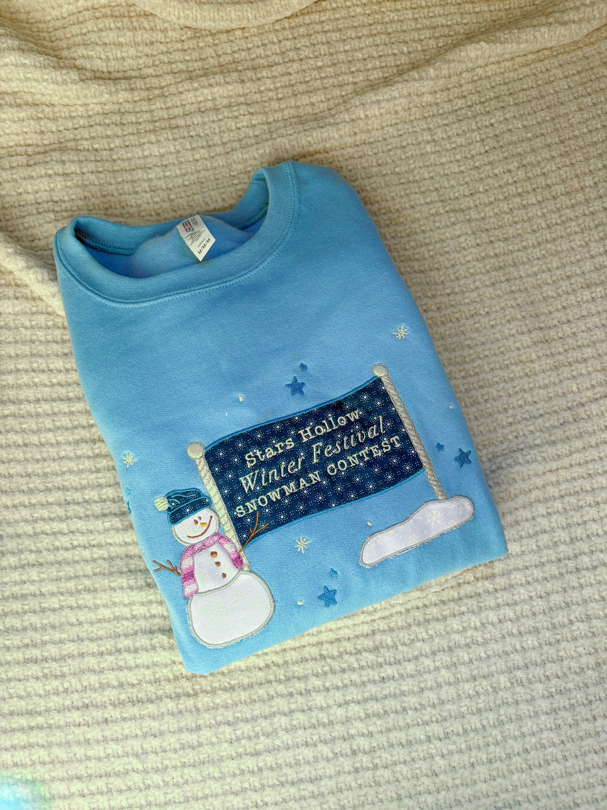 “Stars Hollow Winter Festival Snowman Contest” embroidered on the front with an appliqué snowman